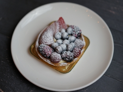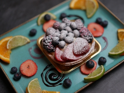 | FRUIT TART A rich fruit tart with strawberries, blueberries and raspberries. | | £7.50 |